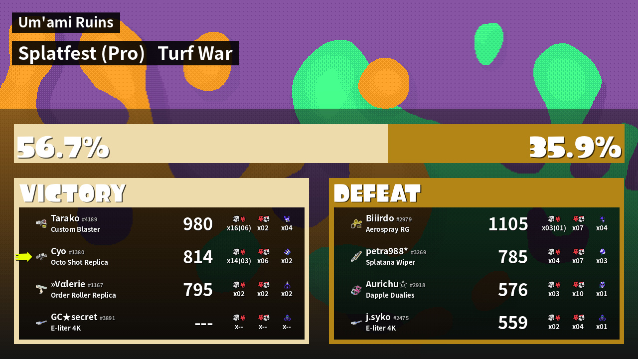 | Mode | Turf War - Splatfest (Pro) | ||