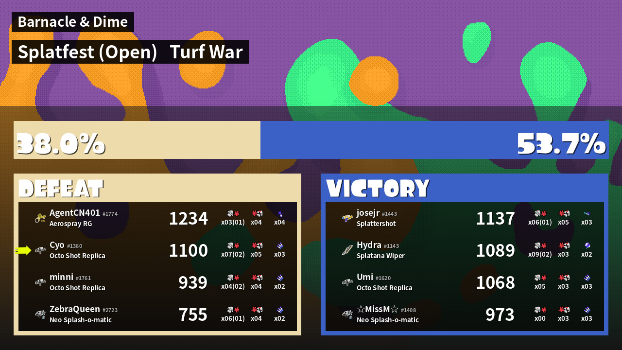 | Medals | #1 Overall Splatter #1 Popular Target #1 Enemy-Base Inker | ||