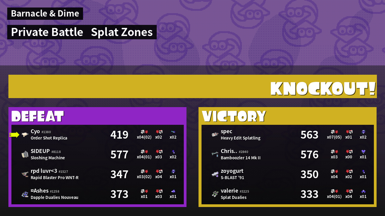 | Mode | Splat Zones - Private Battle | ||
