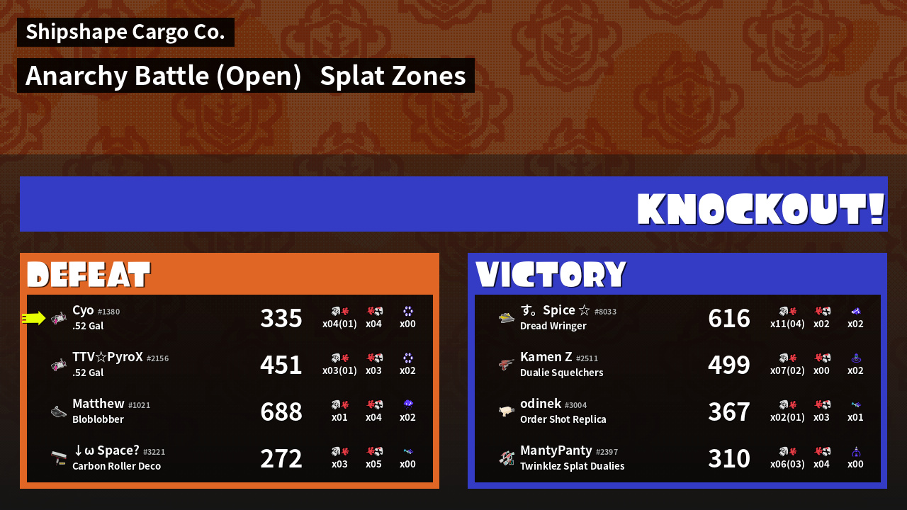 | Mode | Splat Zones - Anarchy Battle (Open) | ||