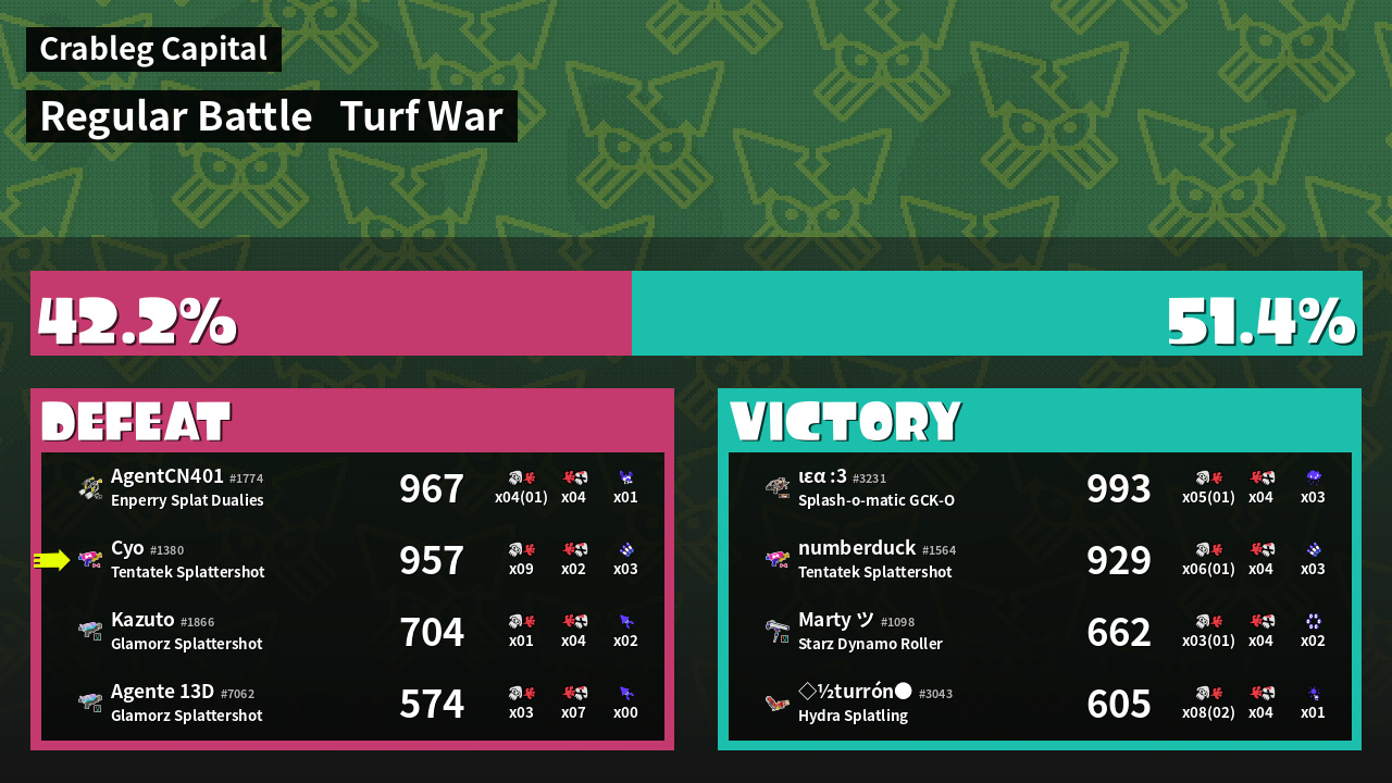 | Medals | #1 Overall Splatter #1 Popular Target #1 Enemy-Base Inker | ||