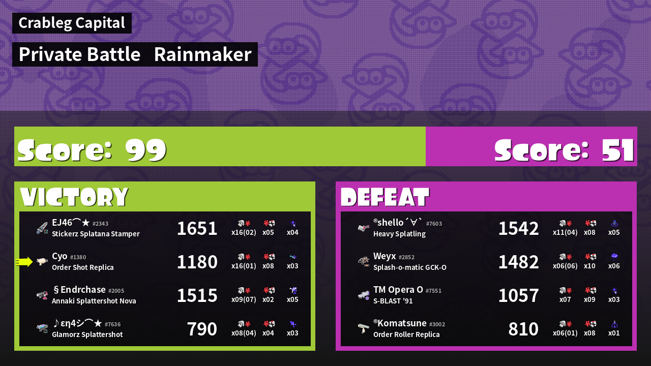 | Medals | #1 Overall Splatter #1 Score Booster #1 Enemy Splatter | ||