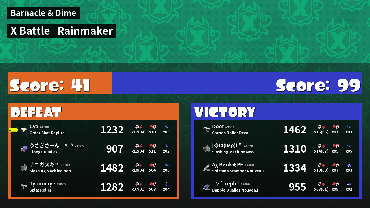 | Medals | #1 Overall Splatter #1 Enemy Splatter #1 Splat Assister | ||