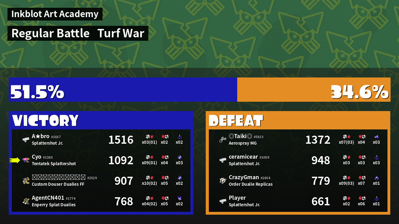 | Weapon | Tentatek Splattershot ( Splat Bomb / Triple Inkstrike) | ||