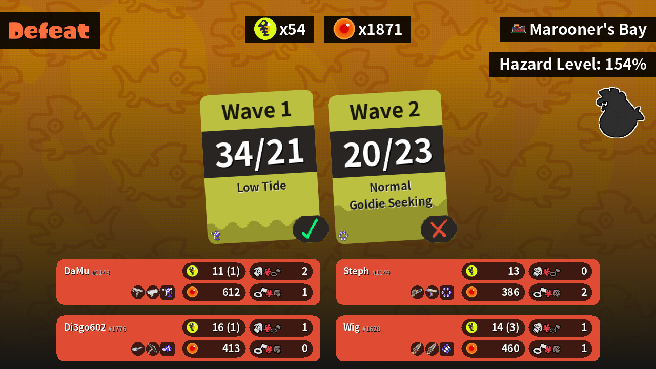| Weapons | Dynamo Roller Splattershot Jr. | E-liter 4K Undercover Brella | Grizzco Splatana Grizzco Splatana | Squeezer Splat Roller |
