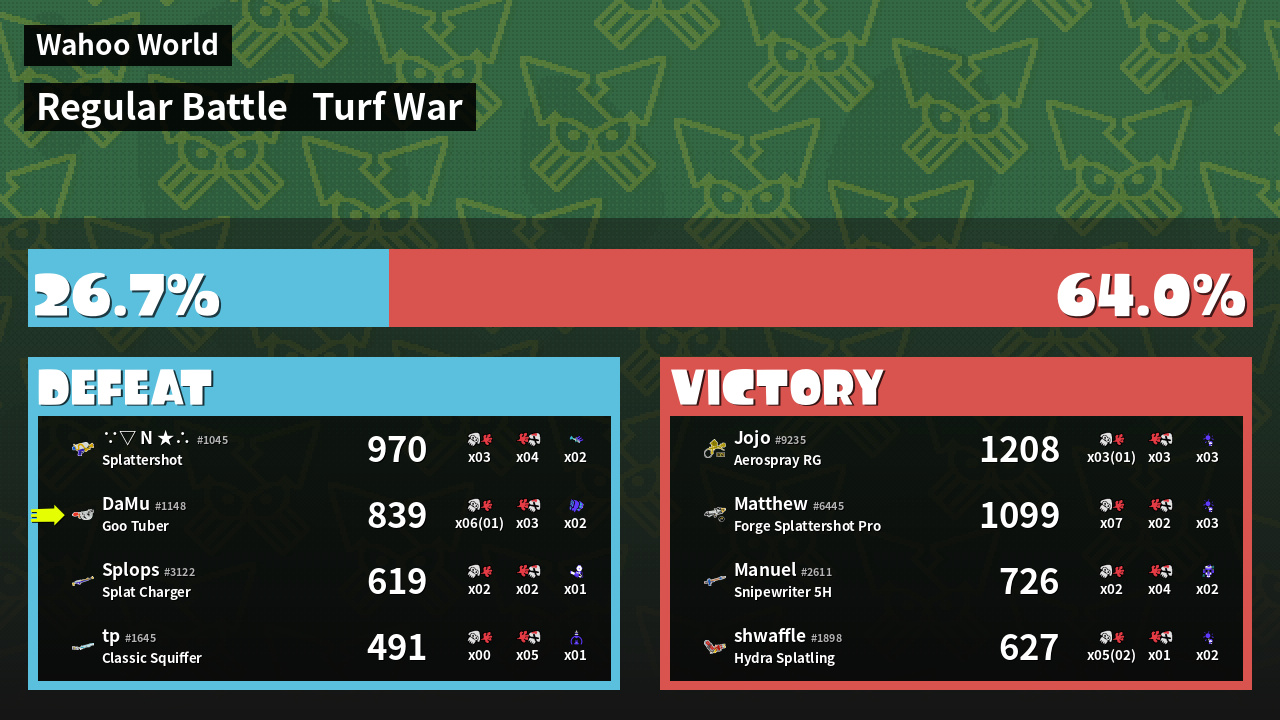 | Medals | #1 Overall Splatter #1 Enemy-Base Inker #1 Enemy Splatter | ||