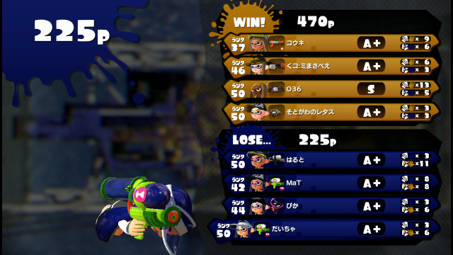 | Tentatek Splattershot | 42 | A+ | 8 / 8 = | 1.00 | 50.0% | |
