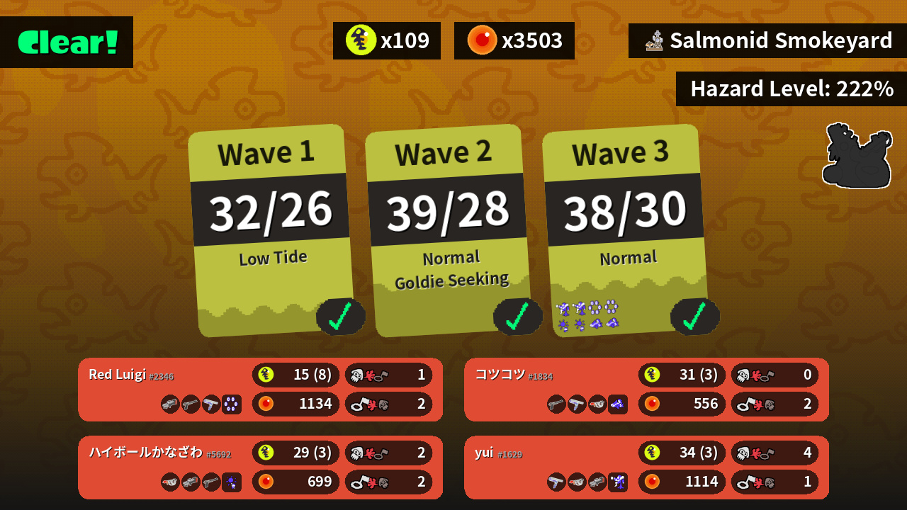 | Weapons | S-BLAST '92 N-ZAP '85 Big Swig Roller | Big Swig Roller Goo Tuber S-BLAST '92 | N-ZAP '85 Big Swig Roller Goo Tuber | Goo Tuber S-BLAST '92 N-ZAP '85 |