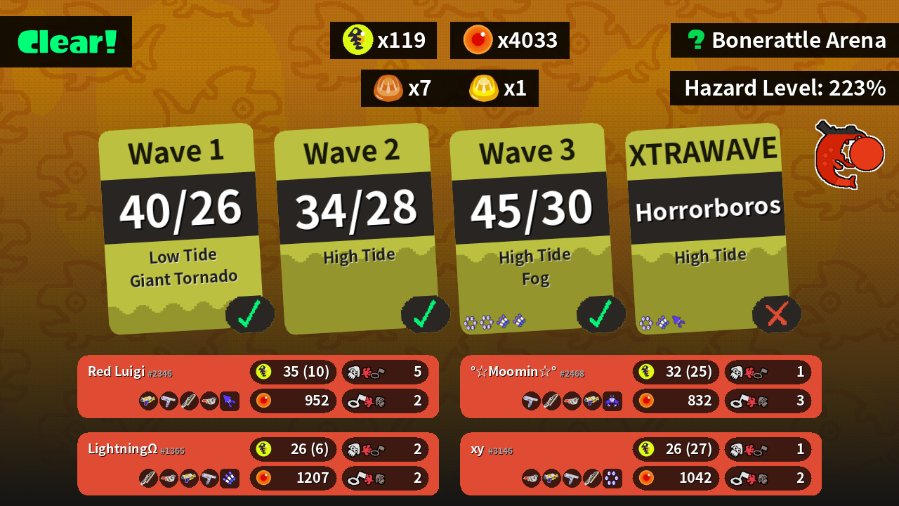 | Weapons | Splattershot Big Swig Roller Splatana Wiper Goo Tuber | Big Swig Roller Splatana Wiper Goo Tuber Splattershot | Splatana Wiper Goo Tuber Splattershot Big Swig Roller | Goo Tuber Splattershot Big Swig Roller Splatana Wiper |