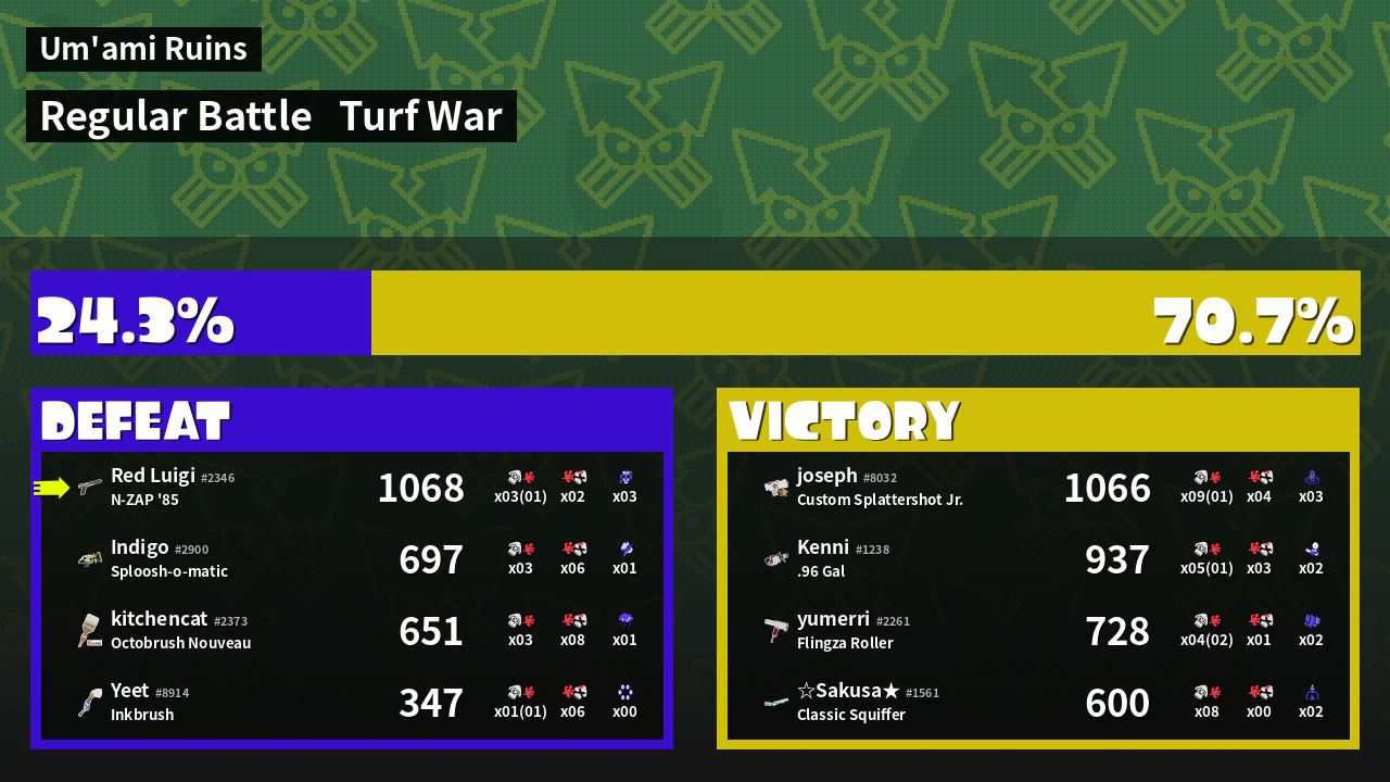 Kills / Deaths | 2 + 1 / 2 = Kill Ratio: 1.00 | ||