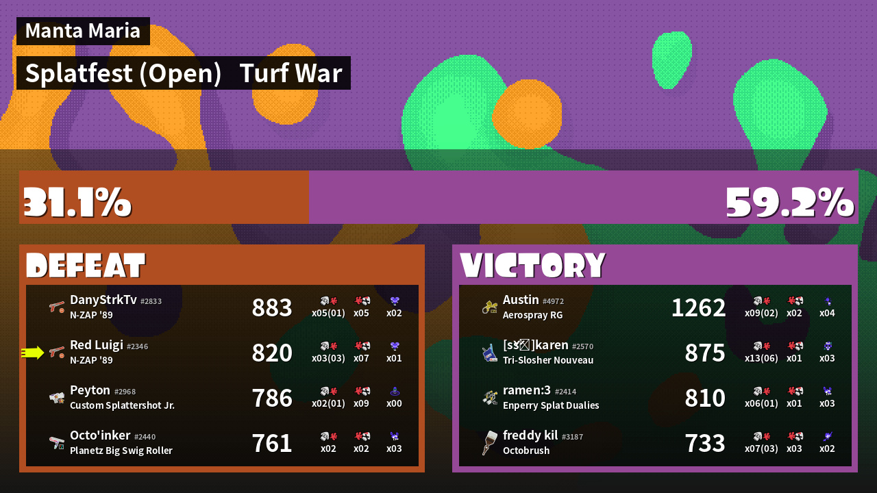 | Medals | #1 Home-Base Inker #1 Splat Assister #2 Overall Splatter | ||