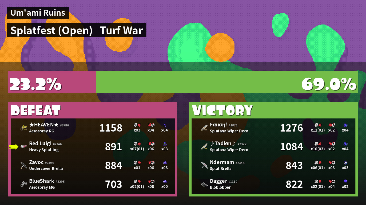 Kills / Deaths | 6 + 1 / 6 = Kill Ratio: 1.00 | ||