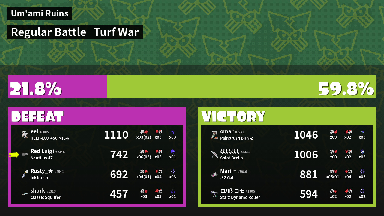 | Medals | #1 Overall Splatter #1 Enemy-Base Inker #1 Super Jump Spot | ||