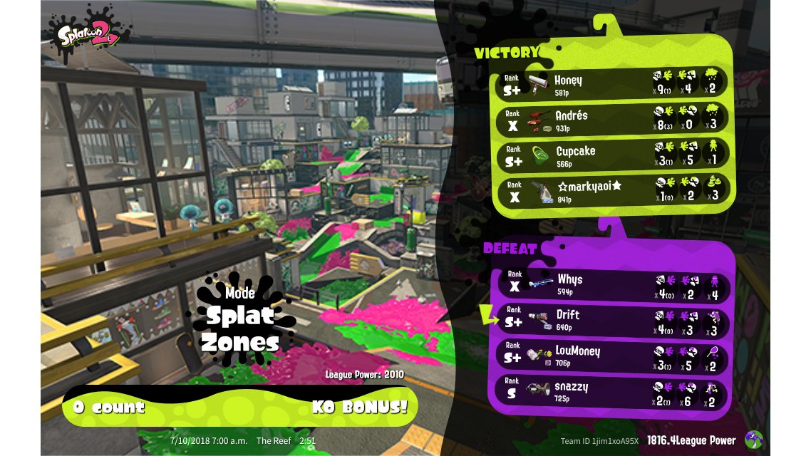| Mode | Splat Zones - League Battle (Quad) | ||||||||||||||||||||||||||||||||||||||||
