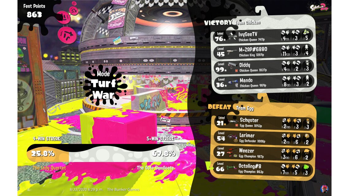 | Mode | Turf War - Splatfest (Normal) | |||||||||||||||||||||||||||||||