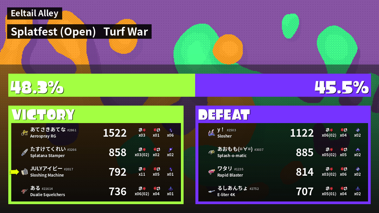 | Medals | #1 Overall Splatter #1 Enemy-Base Inker #1 Enemy Splatter | ||