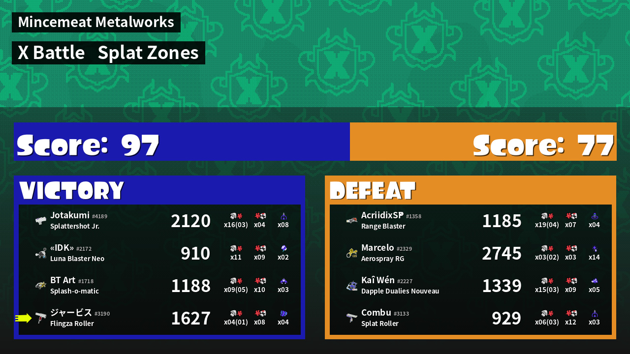 | Medals | #1 Tenta Missiles User #2 Splat Zone Inker #2 Turf Inker | ||