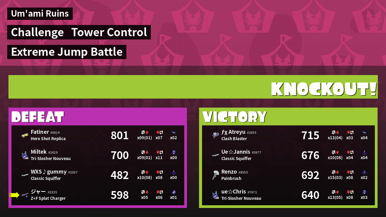 | Medals | #1 Damage Taker #1 Triple Inkstrike User #2 Score Booster | ||