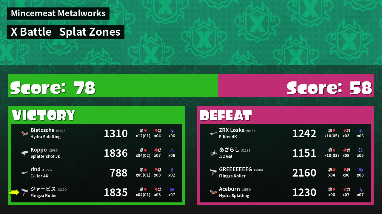 | Medals | #1 Ground Traveler #1 Tenta Missiles User #2 Splat Zone Inker | ||