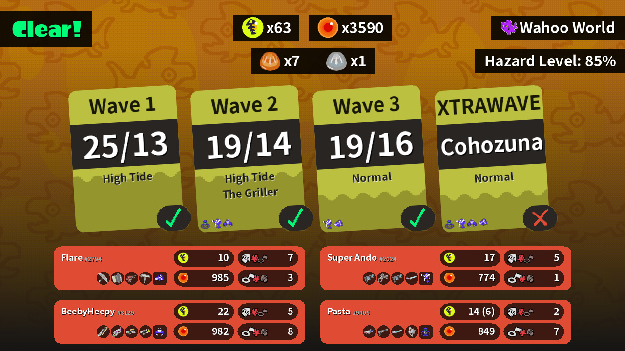 | Weapons | Splat Brella Sloshing Machine Dualie Squelchers Dynamo Roller | Splatana Wiper Dark Tetra Dualies Grizzco Blaster Splattershot Nova | L-3 Nozzlenose Aerospray MG L-3 Nozzlenose Classic Squiffer | Splattershot Pro N-ZAP '85 Classic Squiffer Tri-Stringer |