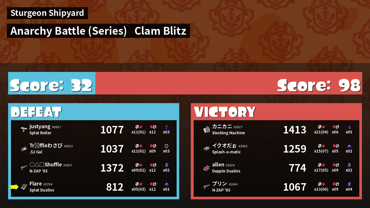 | Medals | #1 Super Jump Spot #1 Splat Assister #2 Clam Carrier | ||