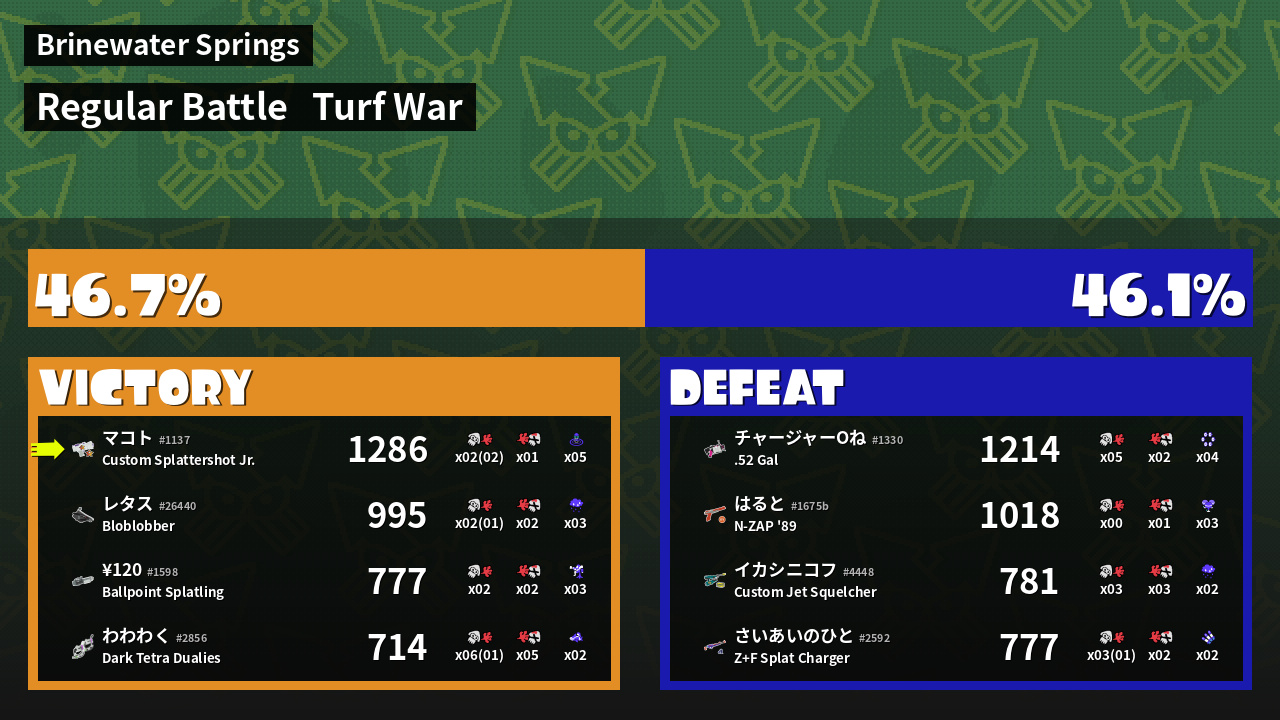| Medals | #1 Turf Inker #1 Splat Assister #1 Ink Consumer | ||
