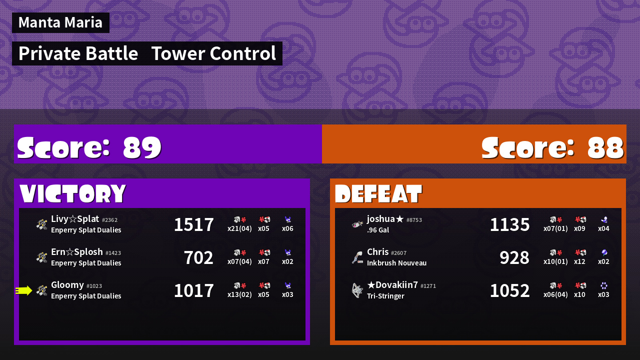| Weapon | Enperry Splat Dualies ( Curling Bomb / Triple Splashdown) | ||