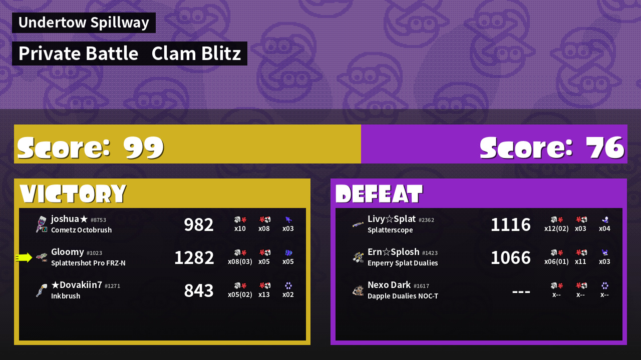 | Medals | #1 Turf Inker #1 Splat Assister #1 Ink Consumer | ||