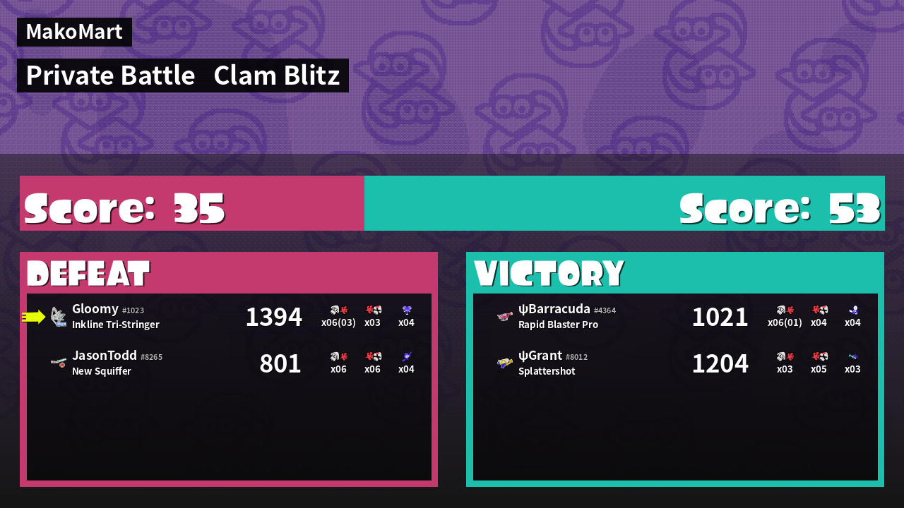 | Medals | #1 Overall Splatter #1 Score Booster #1 Clam Carrier | ||