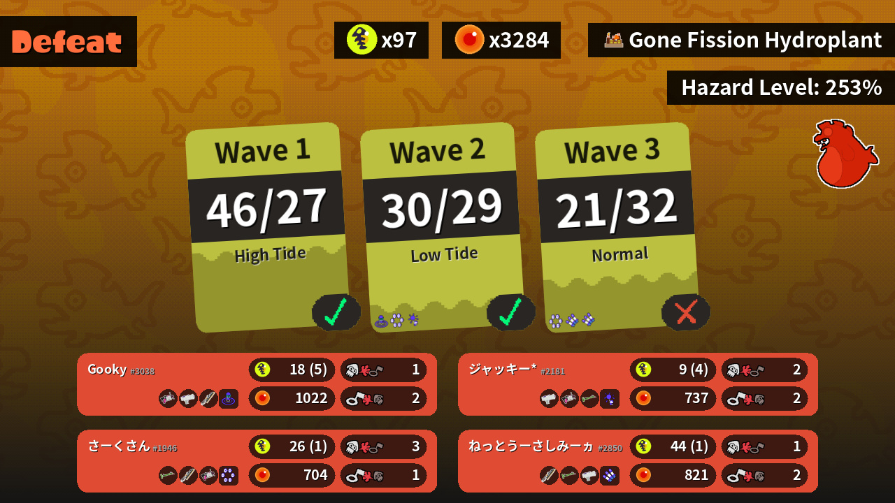 | Weapons | .52 Gal Splattershot Jr. Splatana Wiper | Splatana Wiper Bamboozler 14 Mk I Splattershot Jr. | Bamboozler 14 Mk I Splatana Wiper .52 Gal | Splattershot Jr. .52 Gal Bamboozler 14 Mk I |
