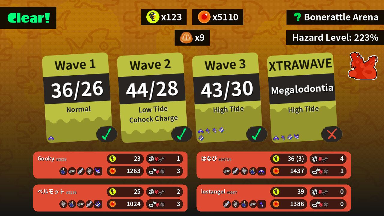 | Weapons | Tri-Slosher Ballpoint Splatling Mint Decavitator Tri-Stringer | Mint Decavitator Tri-Stringer Tri-Slosher Ballpoint Splatling | Ballpoint Splatling Mint Decavitator Tri-Stringer Tri-Slosher | Tri-Stringer Tri-Slosher Ballpoint Splatling Mint Decavitator |