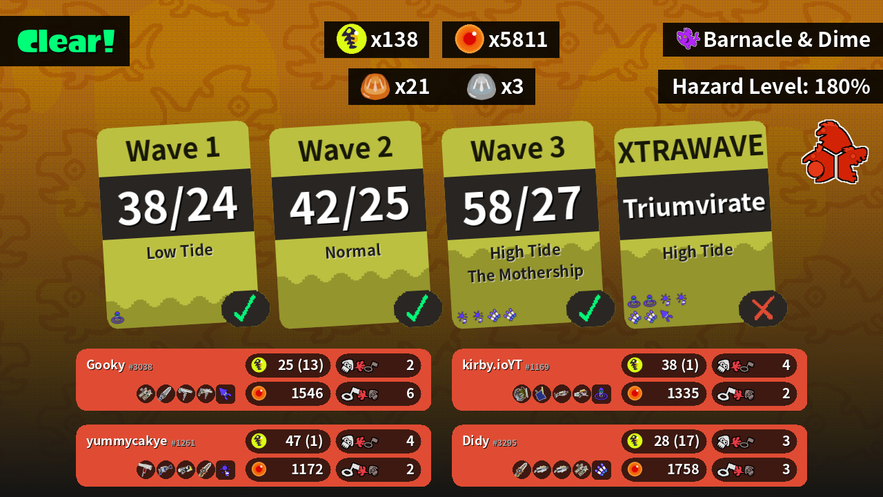 | Weapons | Grizzco Dualies Splatana Stamper Dynamo Roller Grizzco Roller | Flingza Roller H-3 Nozzlenose Splattershot Nova Grizzco Splatana | Grizzco Slosher Tri-Slosher Grizzco Charger Grizzco Blaster | Grizzco Splatana Grizzco Brella Grizzco Brella Grizzco Dualies |