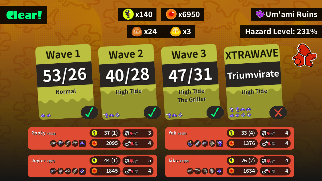 | Weapons | Grizzco Brella Clash Blaster Grizzco Splatana Grizzco Roller | H-3 Nozzlenose Tri-Stringer Grizzco Blaster Grizzco Splatana | Tri-Slosher Mint Decavitator H-3 Nozzlenose Grizzco Dualies | Range Blaster Carbon Roller Tenta Brella Grizzco Stringer |