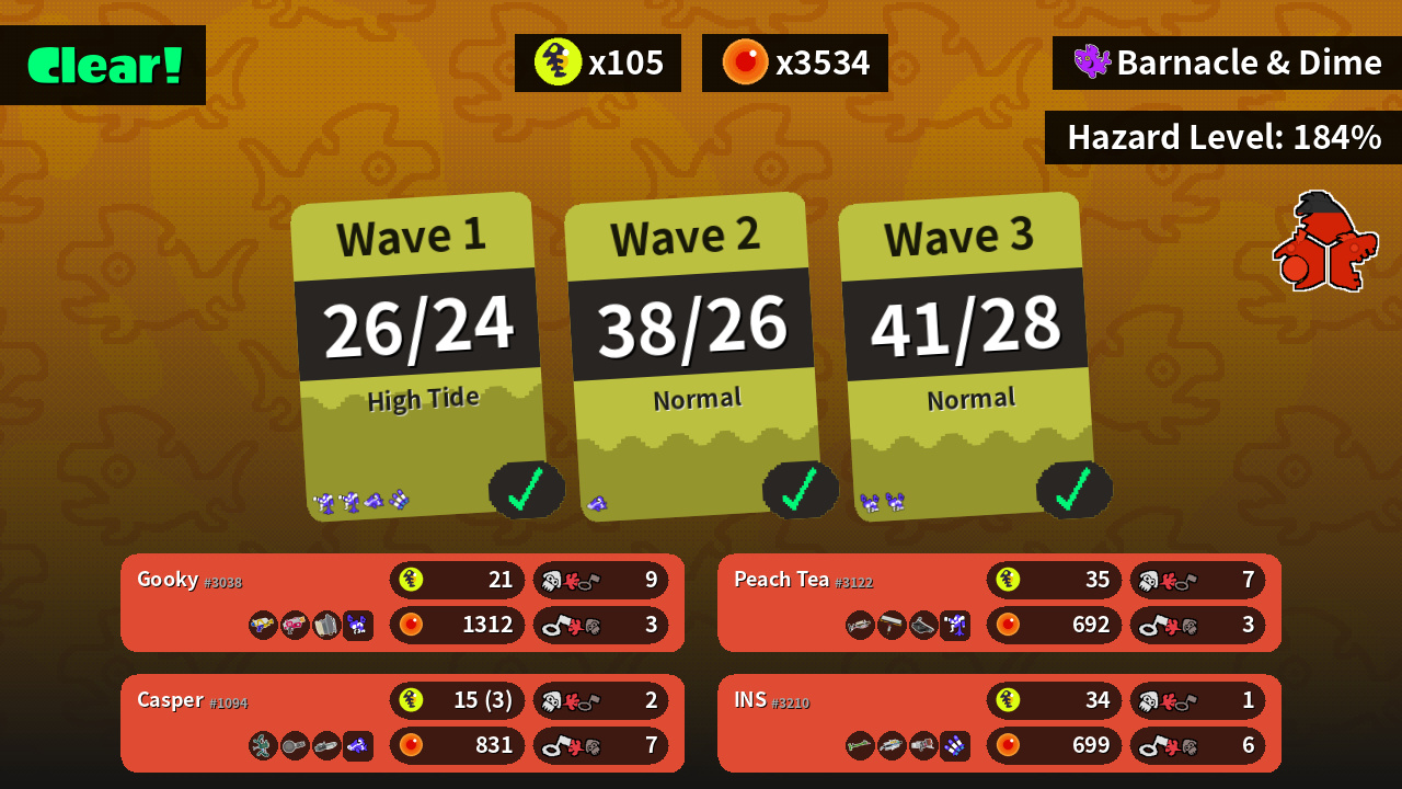 | Weapons | Splattershot Rapid Blaster Sloshing Machine | Grizzco Charger Carbon Roller Bloblobber | Bamboozler 14 Mk I Grizzco Brella Blaster | Wellstring V Nautilus 47 Ballpoint Splatling |