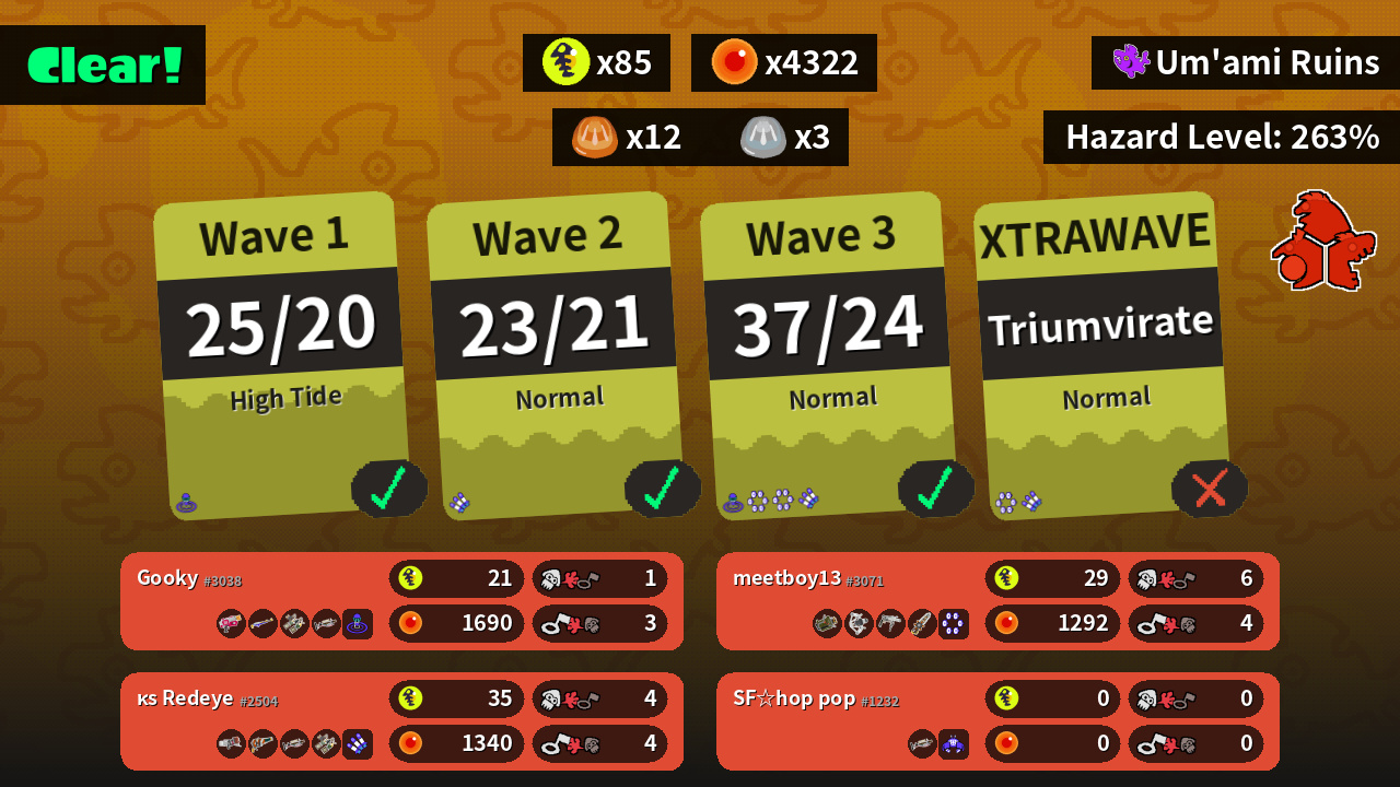 | Weapons | Rapid Blaster Splat Charger Grizzco Dualies Grizzco Charger | Blaster Squeezer Grizzco Charger Grizzco Dualies | Explosher REEF-LUX 450 Grizzco Roller Grizzco Splatana | Grizzco Charger ? ? ? |