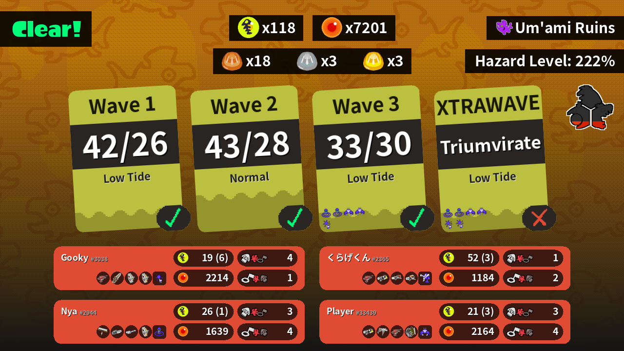 | Weapons | Dualie Squelchers Grizzco Splatana Grizzco Stringer Grizzco Stringer | Dualie Squelchers Splattershot Nova Range Blaster Grizzco Blaster | Carbon Roller Ballpoint Splatling E-liter 4K Grizzco Stringer | Splattershot Nova Grizzco Roller Dualie Squelchers Grizzco Slosher |