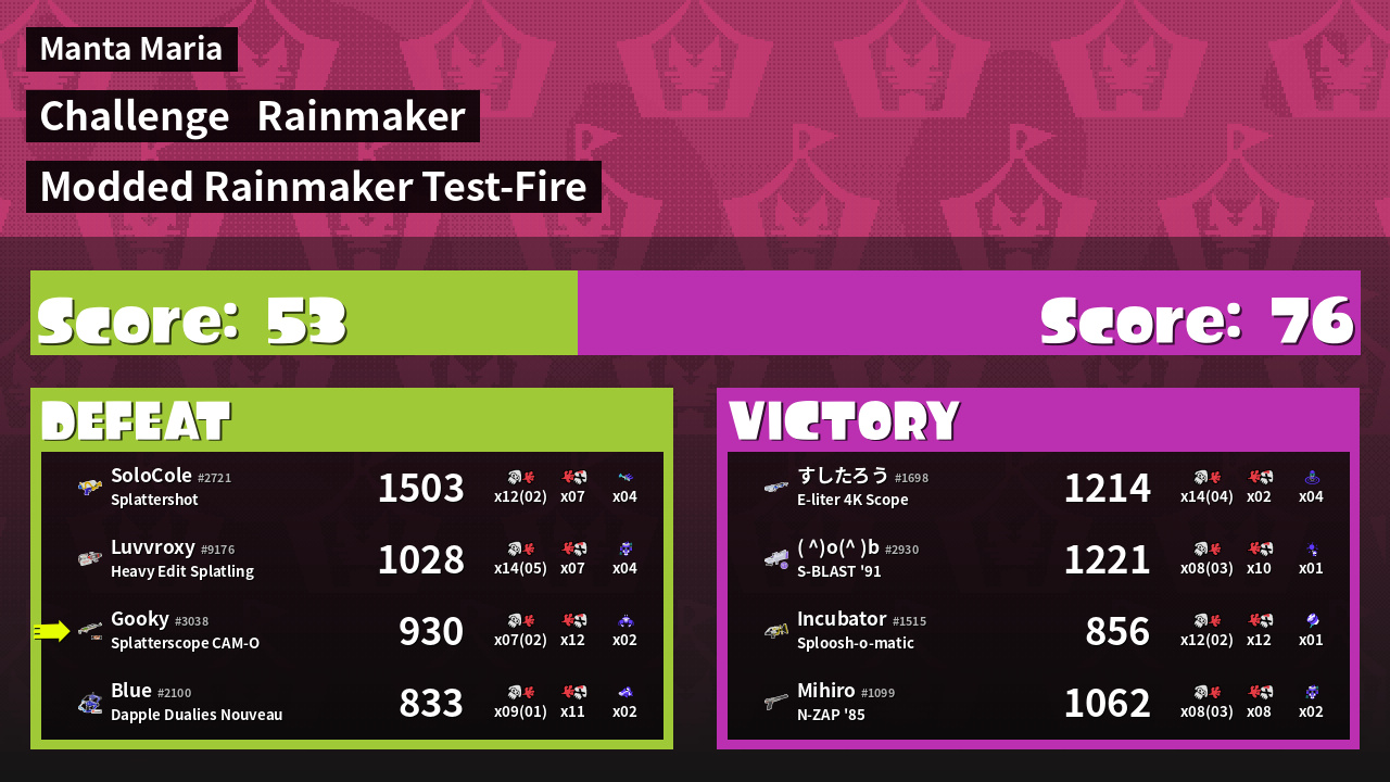| Medals | First Splat! #1 Crab Tank User #2 Splat Assister | ||