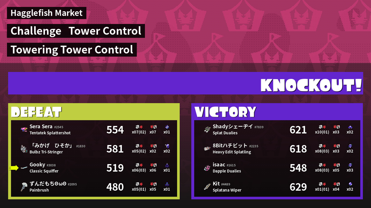 | Medals | #1 Splat Assister #1 Tower Stopper #1 Ink Consumer | ||