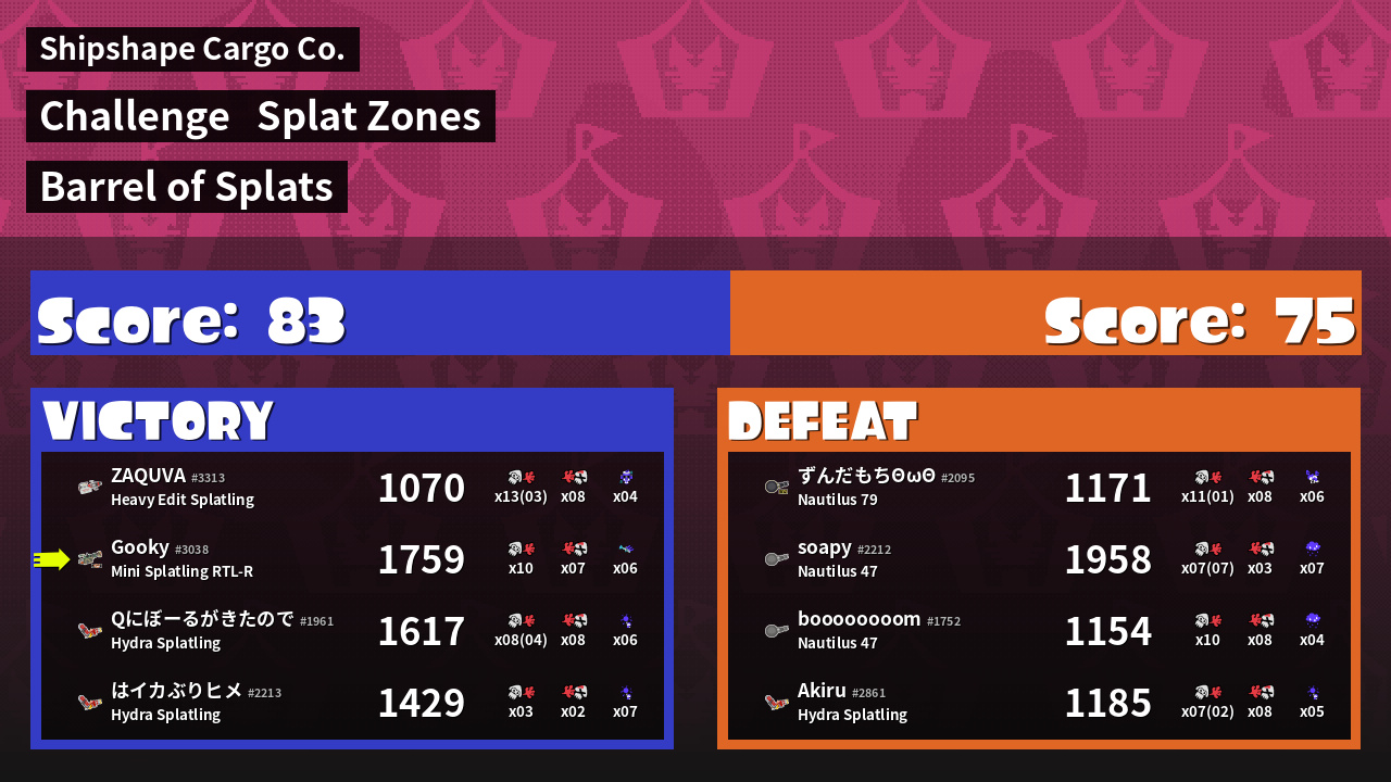 Challenge | Barrel of Splats Muster as much firepower as you can<br />in this battle of the splatlings! | ||