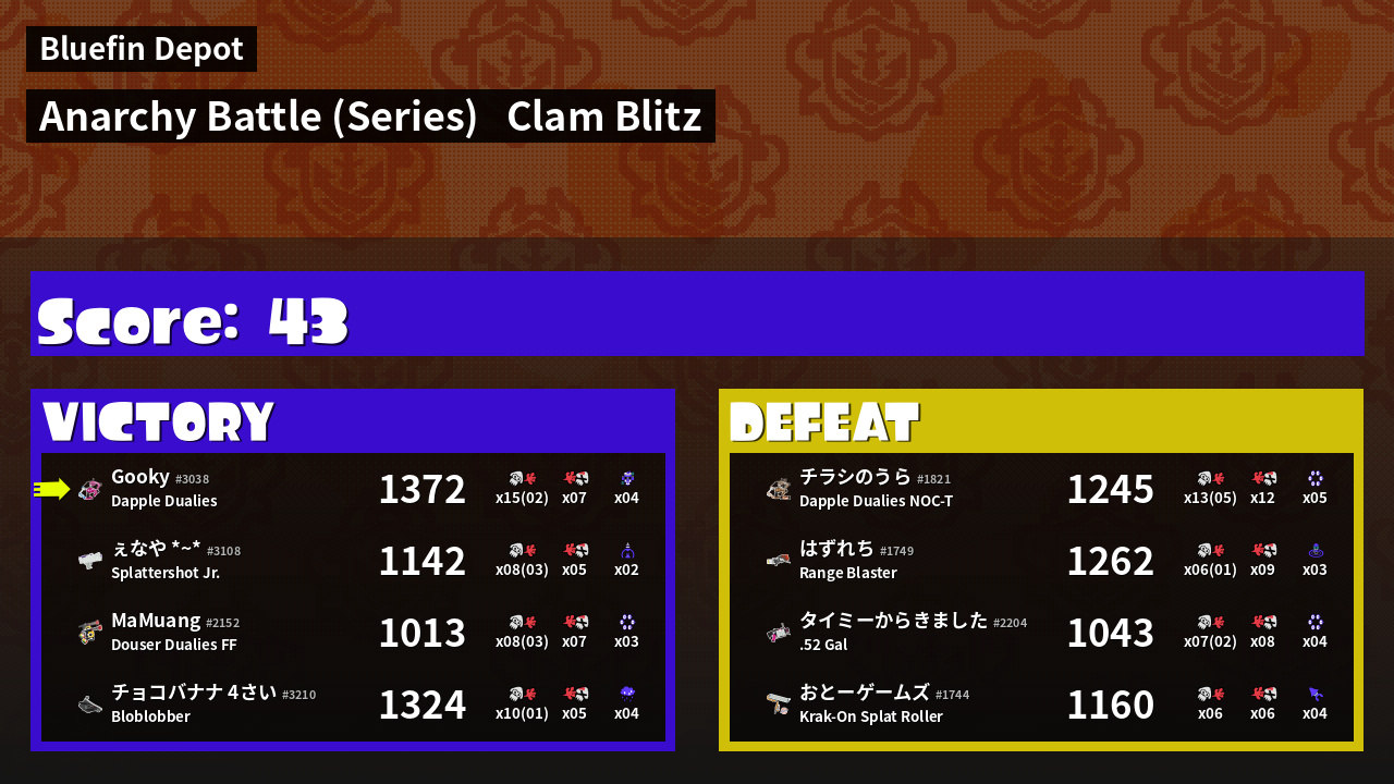 | Medals | #1 Overall Splatter #1 Score Booster #1 Clam Carrier | ||