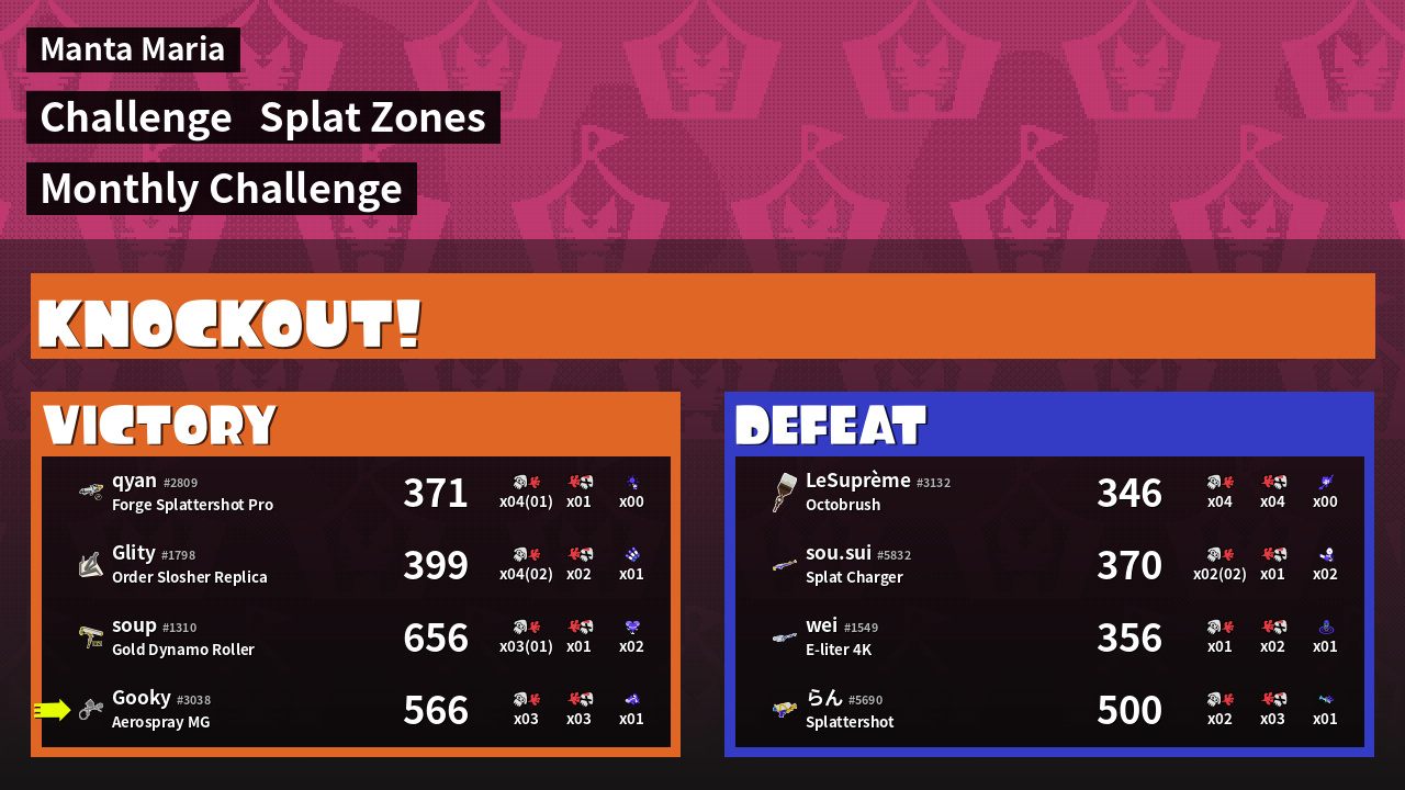 | Medals | #1 Splat Zone Guard #1 Enemy Splatter #1 Ground Traveler | ||
