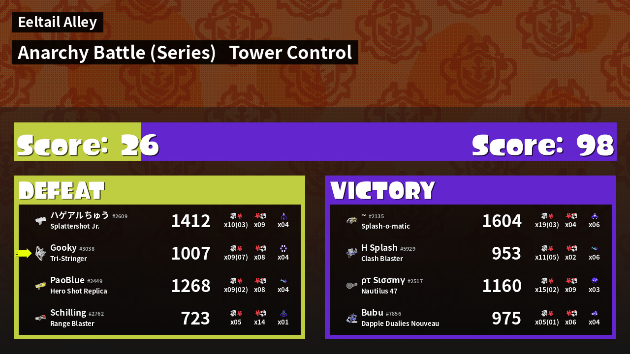 | Medals | #1 Super Jump Spot #1 Splat Assister #1 Tower Stopper | ||
