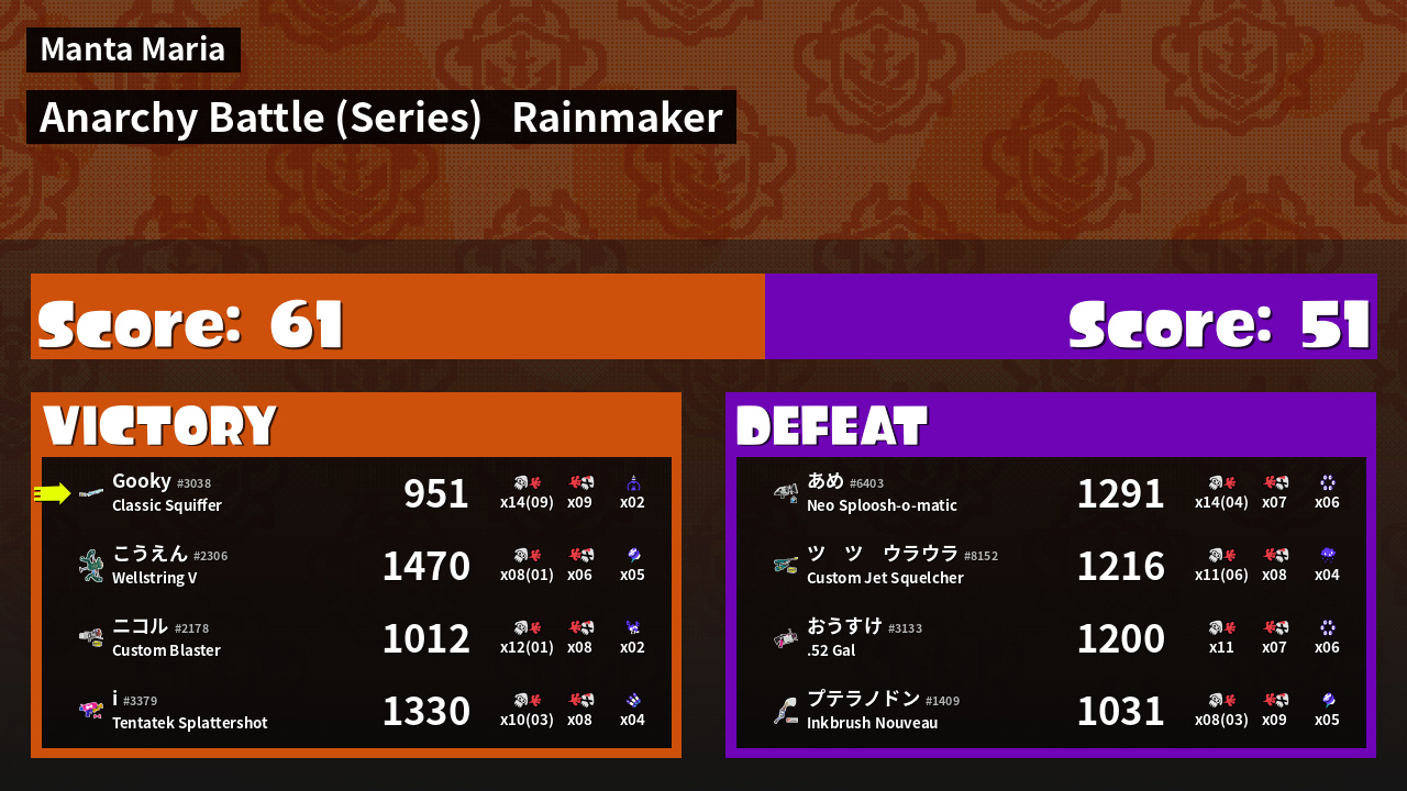 | Medals | #1 Overall Splatter #1 Super Jump Spot #1 Splat Assister | ||
