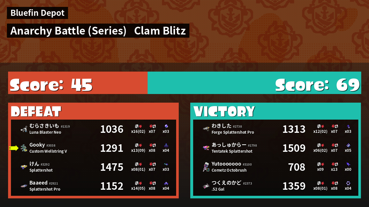 | Medals | #1 Score Booster #1 Clam Carrier #1 Splat Assister | ||