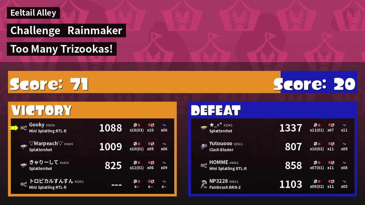 | Medals | #1 Overall Splatter #1 Turf Inker #1 Super Jump Spot | ||
