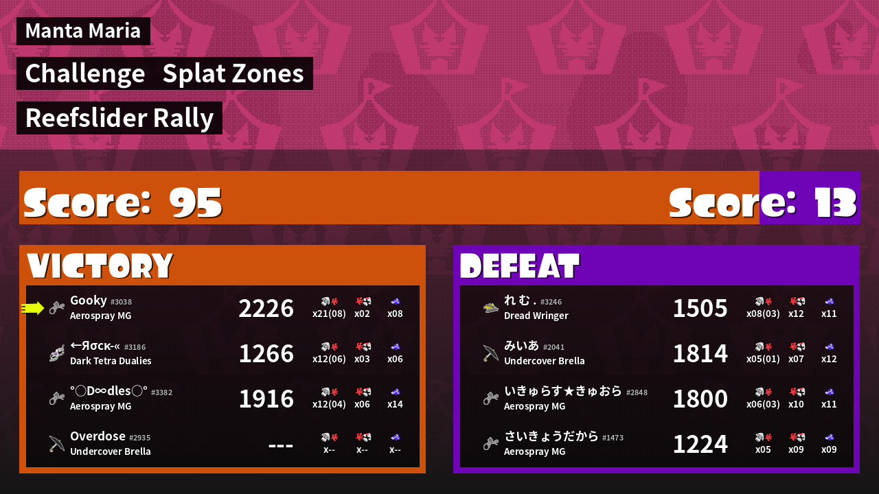 Kills / Deaths | 13 + 8 / 2 > Kill Ratio: 6.50 | ||