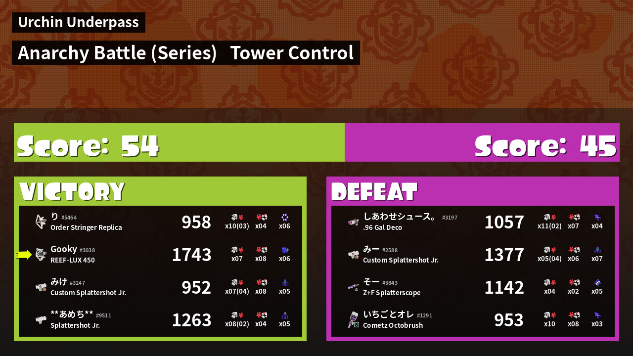 | Medals | #1 Turf Inker #1 Super Jump Spot #1 Enemy Splatter | ||