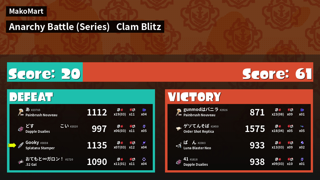 | Medals | #1 Turf Inker #1 Splat Assister #1 Ink Consumer | ||