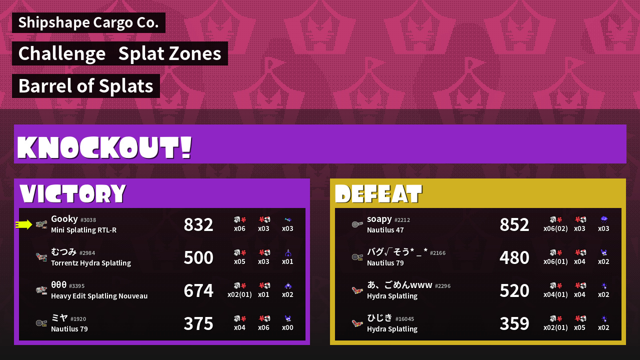 Challenge | Barrel of Splats Muster as much firepower as you can<br />in this battle of the splatlings! | ||