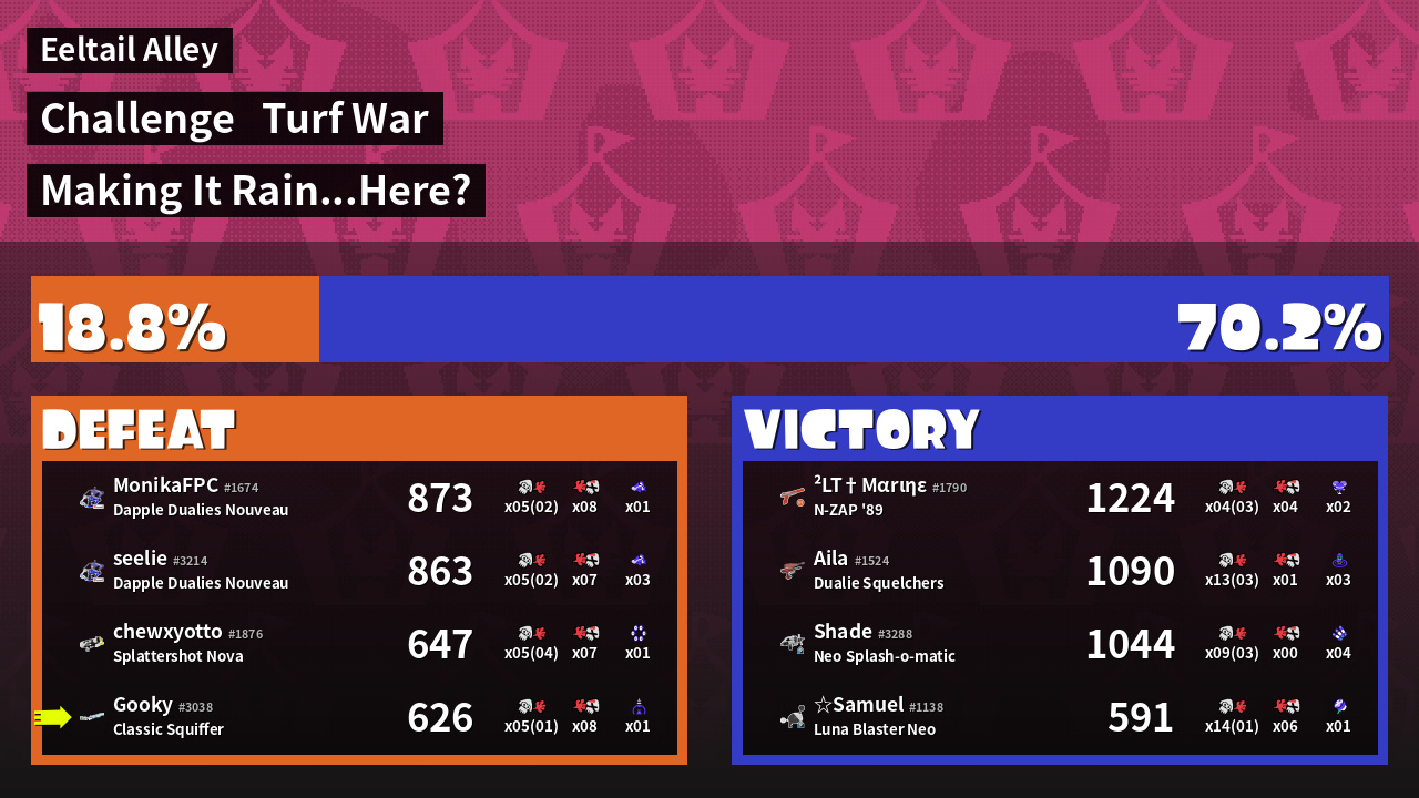 | Medals | #1 Overall Splatter #1 Popular Target #1 Enemy Splatter | ||